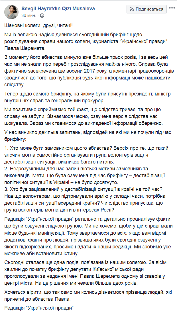 Редакция "Украинской правды" опубликовала комментарий по поводу сегодняшнего брифинга по расследованию дела журналиста издания Павла Шеремета.
