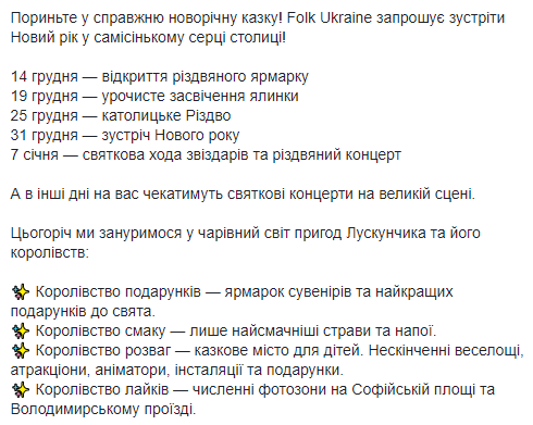 Программа новогодних мероприятий в Киве. Скриншот: Facebook/ Folk Ukraine