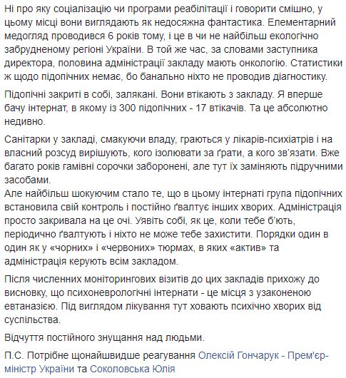 По словам Коваля, на данный момент на территории Стародобровольського психоневрологического интерната работают правоохранительные органы, которые устанавливают факты издевательств.