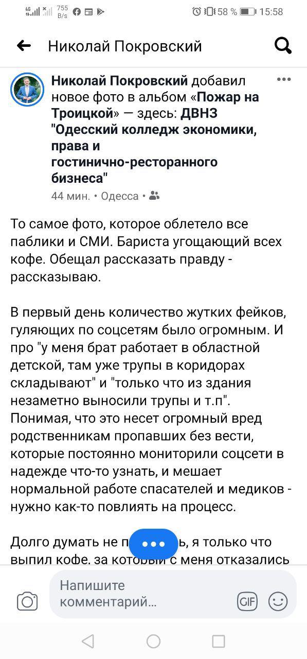 Пресс-секретарь вице-мэра Одессы Андрея Котляра Николай Покровский признал, что придумал историю о великодушном баристе, бесплатно угощавшем кофе спасателей в ночь пожара в колледже экономики, права и гостинично-ресторанного бизнеса. Об этом чиновник написал в своем Facebook.