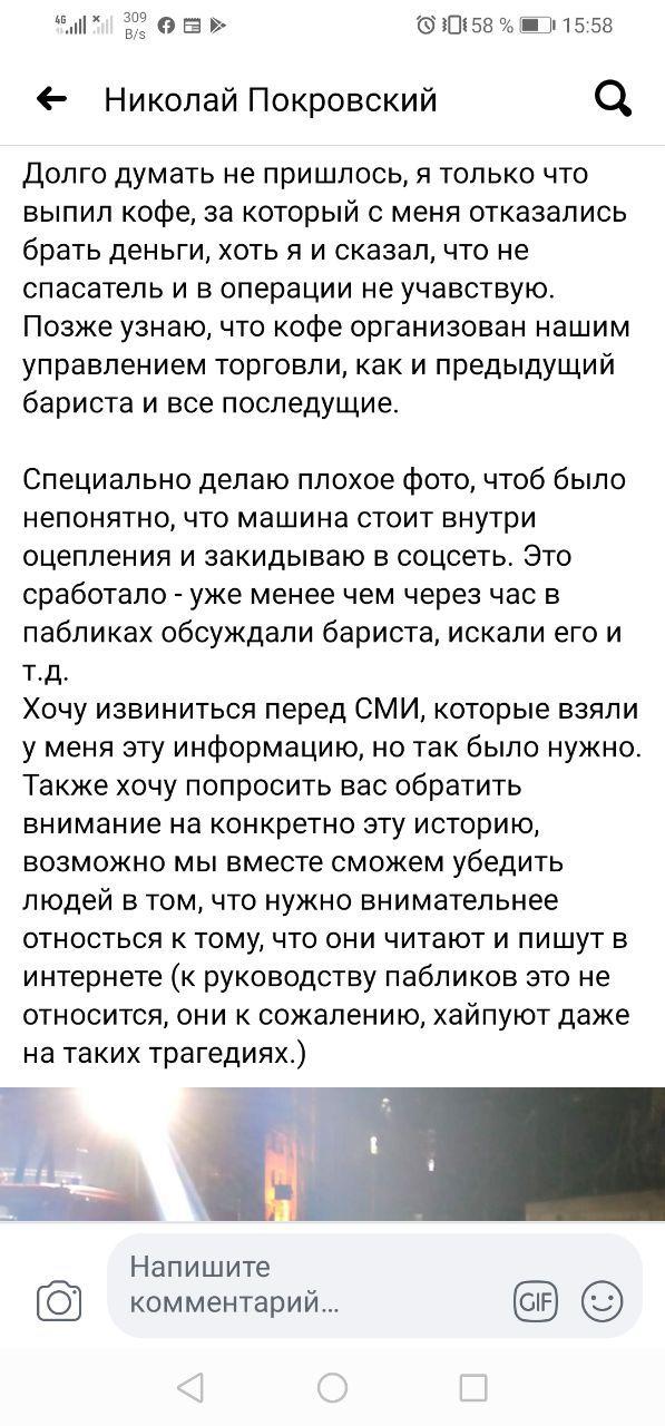 Покровский объяснил вброс фейка благородными мотивами: дескать, в СМИ и соцсетях множились слухи об огромном числе погибших при пожаре, и надо было как-то отвлечь от них. Поэтому он написал о баристе.