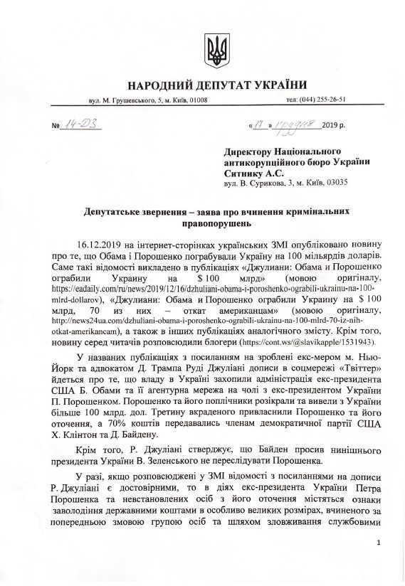"Оппозиционная платформа - За жизнь" направила в НАБУ заявление о коррупционном сговоре Барака Обамы, Петра Порошенко и Джо Байдена в разграблении госбюджета Украины после соответствующей публикации адвоката Трампа Руди Джулиани.