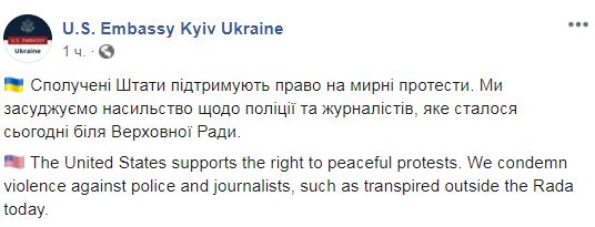"Соединенные Штаты поддерживают право на мирные протесты. Мы осуждаем насилие в отношении полиции и журналистов, которое произошло сегодня возле Верховной рады", - говорится в заявлении.