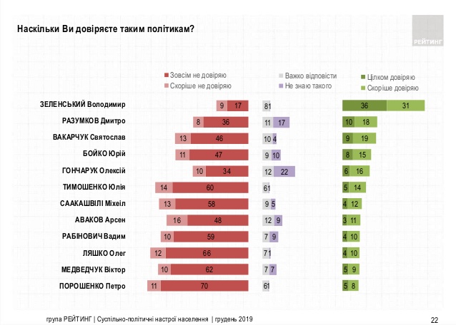 Далее сопредседатель фракции "Оппозиционной платформы – За жизнь" Юрий Бойко (23% и 58%), премьер-министр Алексей Гончарук (22% и 44%) и лидер партии "Батькивщина" Юлия Тимошенко (19% и 74%).