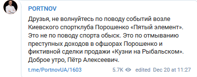 "Друзья, не волнуйтесь по поводу событий возле Киевского спортклуба Порошенко "5 элемент". Это не по поводу спорта обыск. Это по отмыванию преступных доходов в офшорах Порошенко и фиктивной сделки продажи "Кузни на Рыбальском", - написал адвокат в своем Telegram-канале.