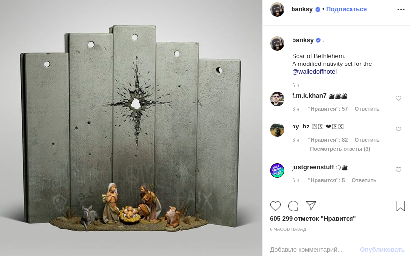 Известный художник Бэнкси, который часто украшает улицы необычными графити, опубликовал в своем Instagram новую работу, которую посветил приближающемуся к Рождеству.