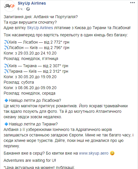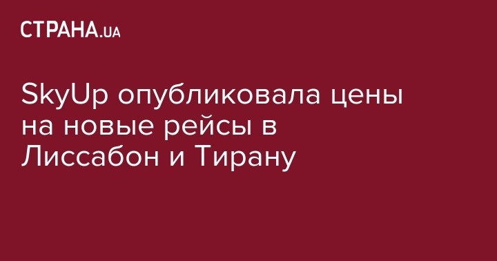 Авиакомпания SkyUp Airlines планирует запустить рейсы из Киева в Тирану (Албания) и Лиссабон (Португалия) весной 2020 года. Об этом сообщается на ее странице в соцсети.