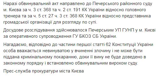 Кроме того, следствие установило, что тренер якобы совершила растрату бюджетных средств в размере 141 000 гривен, находясь на спортивном мероприятии в Берлине в 2018 году.