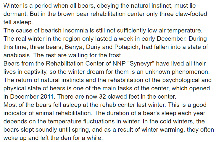 В центре живут 32 медведя, которые ранее всю свою жизнь прожили в неволе, поэтому зимний сон для них явление неизвестное. Отмечается, что в 2018 году в центре уснула большая часть медведей.