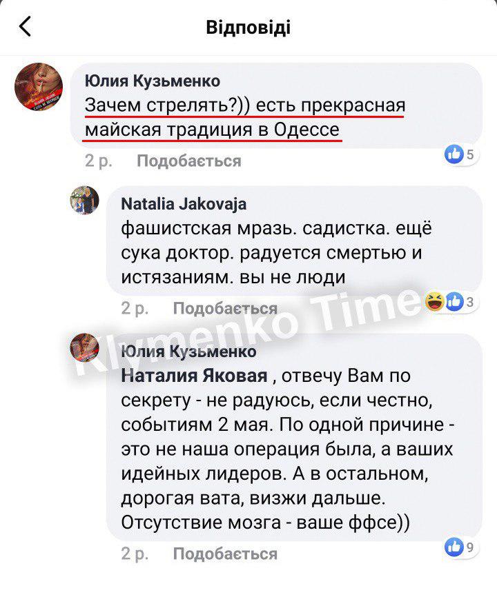 В Сети опубликовали комментарий Кузьменко в Facebook, где она поддерживает сожжение людей в Одессе 2 мая 2014 года. Убийство антимайдановцев она называет "прекрасной майской традицией".