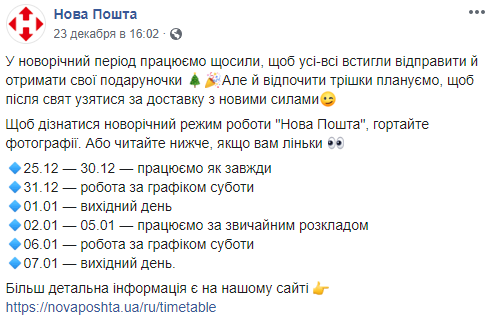 На Новой почте на зимние праздники ожидаются изменения в графике.
