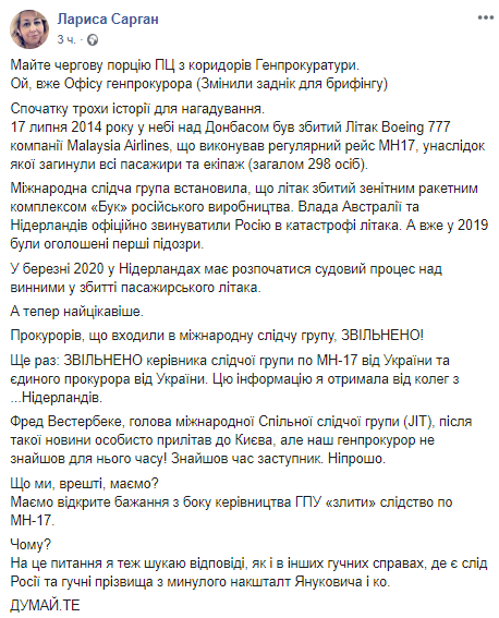 "Прокуроров, входивших в международную следственную группу, уволили! Еще раз: уволен руководитель следственной группы по МН17 от Украины и единственный прокурор от Украины. Эту информацию я получила от коллег из ... Нидерландов", - написала Сарган.