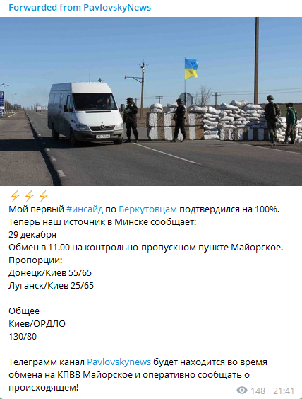 Обмен пленными пройдет 29 декабря, в 11:00 на контрольно-пропускном пункте Майорское. Об этом сообщает Telegram-канал Рavlovskynews.