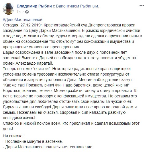 Также адвокат сообщил, что Дарья Мастикашева является гражданкой Украины с пропиской в Днепродзержинске, и после проведённого обмена Дарья вернется обратно в родной город к матери и ребёнку. По словам адвоката - признание вины его подзащитной было единственной возможностью завершить уголовное дело в котором фигурировала Мастикашева.