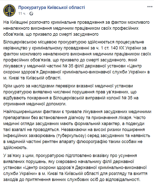 Кроме того, по результатам проверки медицинского учреждения прокуратура выявила многочисленные нарушения прав заключенных, отбывающих наказание в Белоцерковской исправительной колонии №35. В том числе права на получение медицинской помощи.