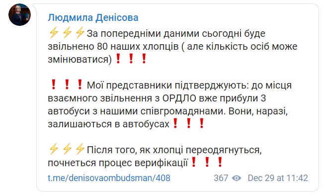 "По предварительным данным, сегодня будет освобожден 80 наших ребят (но количество лиц может меняться). Мои представители подтверждают: к месту взаимного освобождения от ОРДЛО уже прибыли 3 автобуса с нашими согражданами. Они, пока остаются в автобусах. После того, как ребята переоденутся, начнется процесс верификации", — написала обмудсмен.