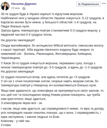 В понедельник, 30 декабря, днем ​​температура воздуха будет 0...-3 градуса. В южной части страны ожидается 0...+4 градуса. Об этом сообщила на своей странице в Facebook синоптик Наталья Диденко.