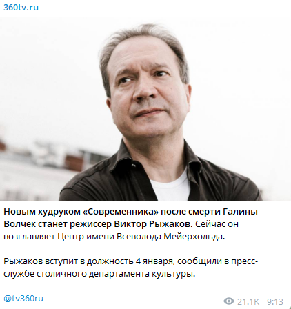 Новым художественным руководителем театра "Современник" после смерти Галины Волчек станет режиссер Виктор Рыжаков. Об этом сообщает "360" со ссылкой на пресс-службу департамента культуры Москвы.
