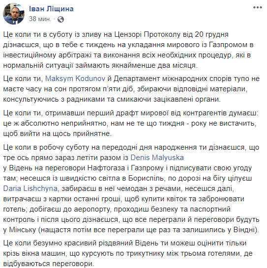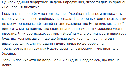 "...Украина и Газпром подписывают мировое соглашение в инвестиционном арбитраже. Подробностей сделки я раскрывать не могу, потому что она конфиденциальная, но важно, что Россия отзывает свои требования, а мы не нарушаем своего правила не заключать мировых соглашений в инвестиционных арбитражах по которым Украина должна платить инвестору любую компенсацию. И, что еще более важно, подписание соглашения открывает путь для заключения долгосрочных договоров на транспортировку газа между Нафтогазом и Газпромом, к которым стремилась Украина.