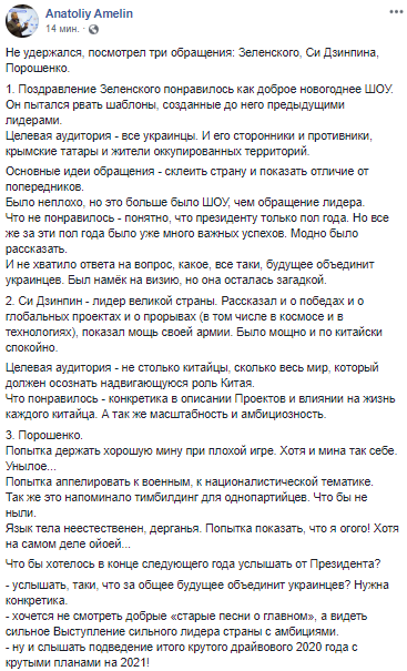 "Не удержался, посмотрел три обращения: Зеленского, Си Дзинпина, Порошенко.