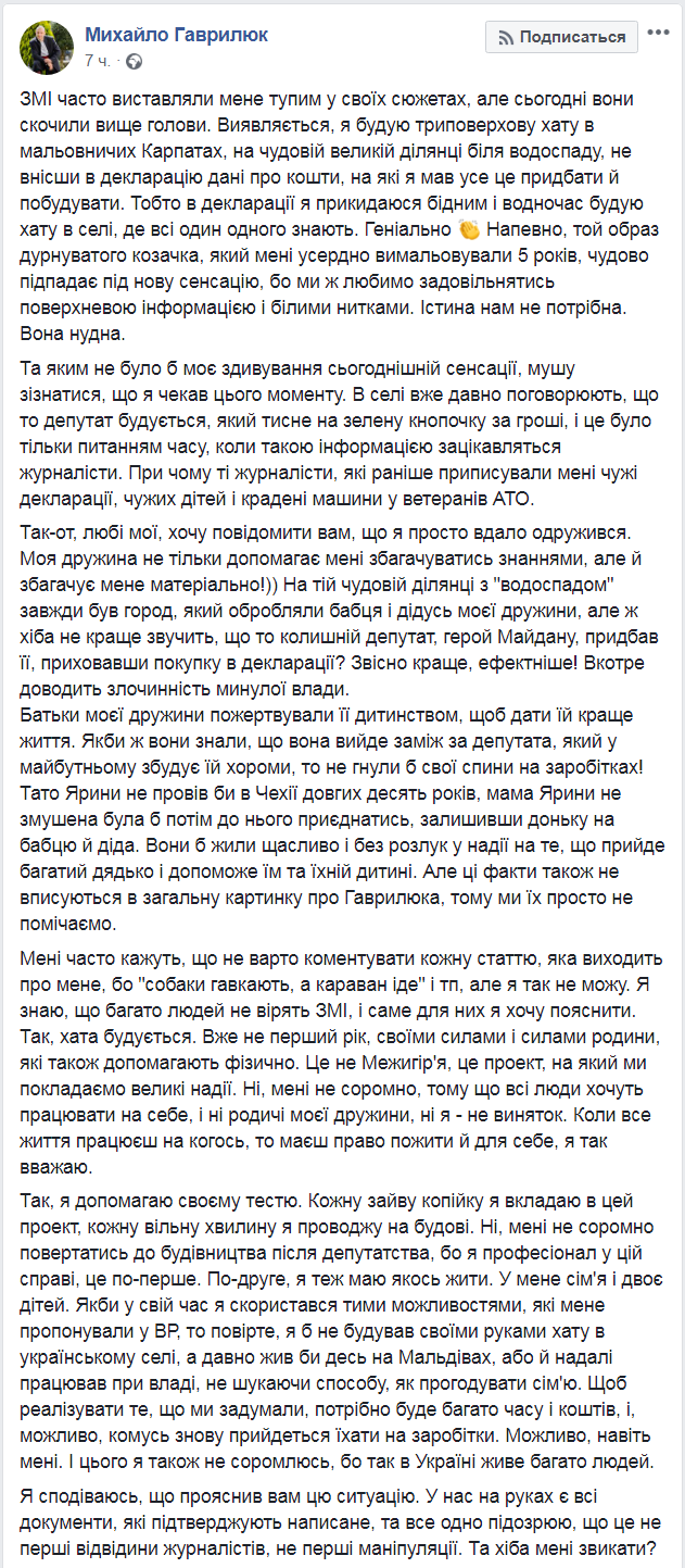 "Оказывается, я строю трехэтажный дом в живописных Карпатах, на прекрасном большом участке возле водопада, не внеся в декларацию данные о средствах, на которые я все это приобрел и построил", – с горечью написал "казак".