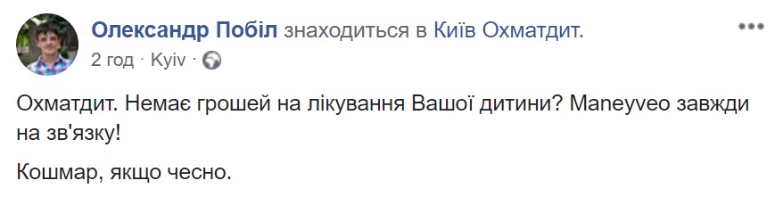 "Охматдит. Нет денег на лечение Вашего ребенка? Maneyveo (имеется в виду Moneyveo - Ред.) всегда на связи! Кошмар, если честно", - пишет Александр.