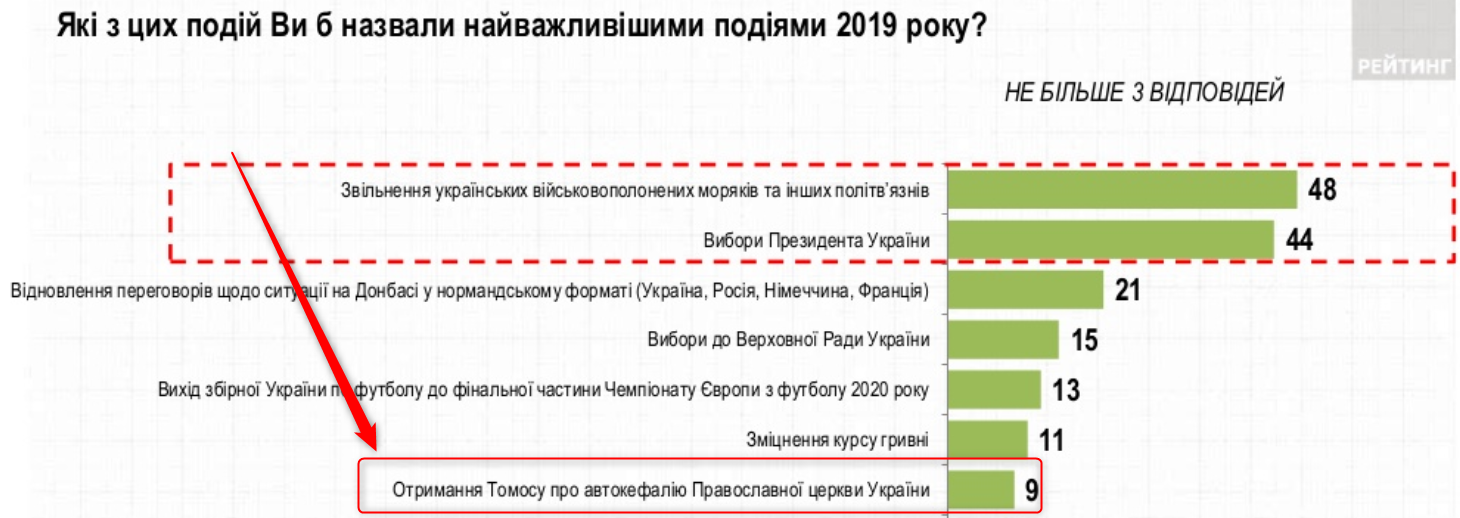 Оценивая самые важные прошлогодние события, только 9% украинцев упомянули Томос. Это примерно соответствует количеству голосовавших за партию Порошенко - одного из "отцов" автокефалии.