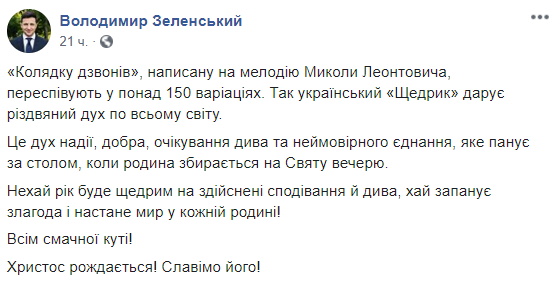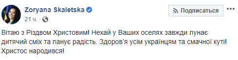 "Верю, что Христос рождается в сердце каждого из нас. И не только 25 декабря или 7 января, а ежедневно. Каждый раз, когда мы своими мыслями, словами и делами дарим друг другу любовь и тепло. Собравшись в Сочельник, поздравляя колядками - с сегодняшнего дня до Иордана - помним о тех, благодаря кому на большинстве территории Украины царит мир. О наших воинах-защитниках. Храни их Господь, и всю нашу Украину!