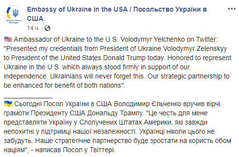 "Это честь для меня представлять Украину в Соединенных Штатах Америки, которые всегда твердо поддерживали нашу независимость. Украинцы никогда этого не забудут. Наше стратегическое партнерство будет расти на пользу обеим нациям", - говорится в сообщении на официальной странице посольства Украины в США в соцсети Facebook.