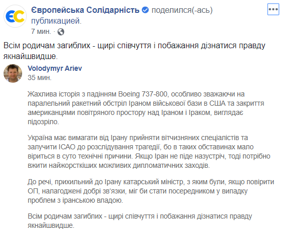 "Ужасная история с падением Boeing 737-800, особенно учитывая параллельный ракетный обстрел Ираном военной базы в США и закрытие американцами воздушного пространства над Ираном и Ираком, выглядит подозрительно",  -пишет Арьев.