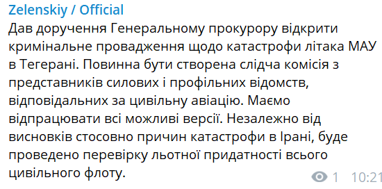 10:22  Зеленский дал указание открыть дело по факту авиакатастрофы в Иране и создать межведомственную следственную группу. И проверить весь летный состав гражданского флота.