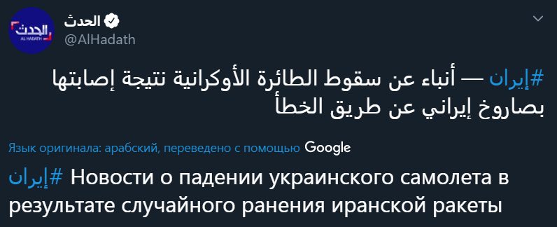 7:44  Возвращаясь к истории, что самолет погиб якобы от иранской ракеты. Эта информация пошла из Твиттера палестинского агентства "Аль-Хадат". Однако на сайте этого СМИ ее найти не удалось.