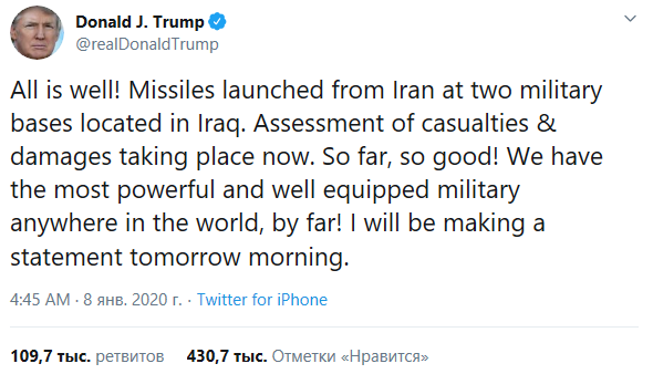 "Все хорошо! Ракеты выпущены из Ирана на две военные базы, расположенные в Ираке. Сейчас проводится оценка жертв и повреждений. Все идет нормально! На сегодняшний день у нас самые мощные и хорошо оснащенные военные в мире! Я сделаю заявление завтра утром", - написал в Twiitter глава Белого дома.