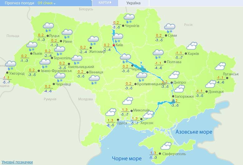 Погода в Украине в четверг, 9 января, будет относительно теплой днем с заморозками ночью. Кроме того, практически во всей Украине ожидается мокрый снег. Об этом говорят данные Укргидрометцентра.