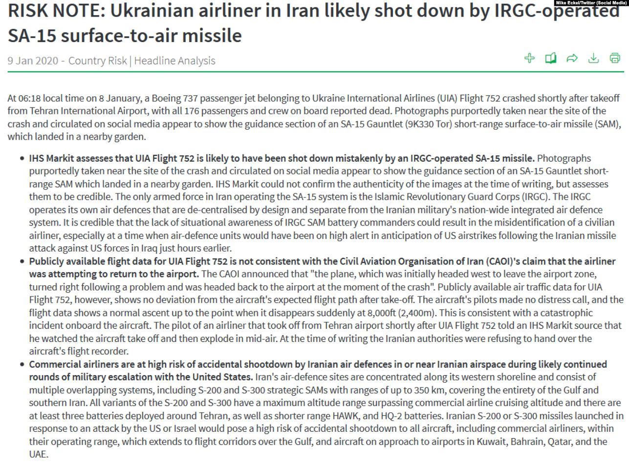 В IHS Markit отметили, что публично доступные данные полета рейса МАУ не соответствуют заявлению Организации гражданской авиации Ирана, будто лайнер пытался вернуться в аэропорт. Общедоступные данные об авиаперевозках не показывают отклонения самолета от курса после взлета. Данные полета показывают нормальный подъем до той точки, когда он внезапно исчез с радаров на высоте в 2400 м. Это подтверждает версию о ракете.