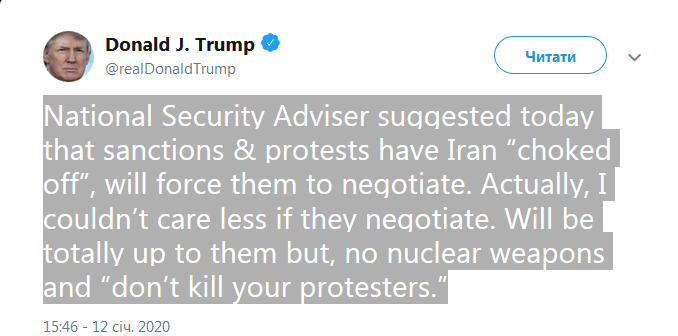 "Советник по национальной безопасности предположил сегодня, что санкции и протесты уже "перекрыли кислород" Ирану и заставят его начать переговоры. На самом деле, мне все равно, начнутся переговоры или нет", - написал американский лидер.