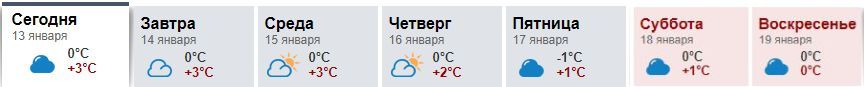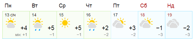 По данным Gismeteo, с понедельника по пятницу включительно в Киеве днем +3...+5. Ночью +1...-2. На выходных, 18-19 января, днем -1...-2, ночью до -3. Во вторник, 14 января, и в четверг, 16 января, возможен дождь.