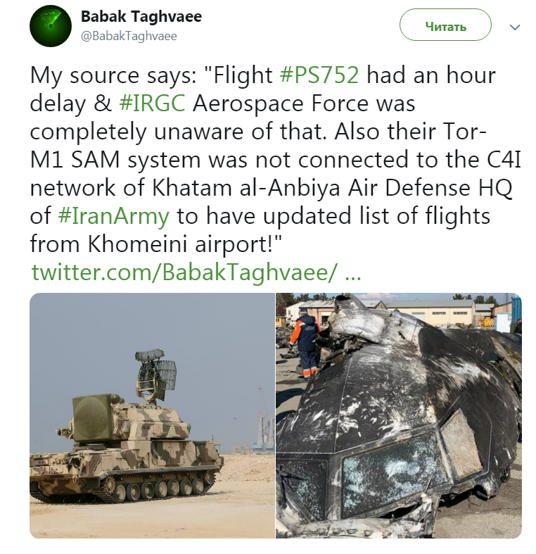 Вторая причина рокового выстрела в том, что зенитный ракетный комплекс (ЗРК) "Тор-М1", оператор которого решил сбить самолет, не был подключен к C4I - автоматизированной системе управления и разведки. Из-за этого у оператора не было актуальных данных о вылетах из тегеранского аэропорта.