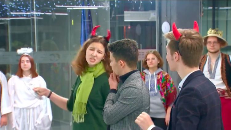Участники выступления переоделись в ангелов, чертей, вышиванки и другие образы, и показали политическую сценку, высмеяли президента Зеленского, главу ОП Богдана и других.
