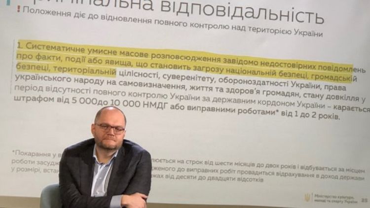 "20 января 2020 года, Министерство культуры, молодежи и спорта Украины опубликовало текст проекта закона о борьбе с дезинформацией и регулирования деятельности СМИ. По словам министра культуры, молодежи и спорта Владимира Бородянского, закон имеет целью противостоять российской дезинформации. Однако журналистское сообщество считает, что эта инициатива, вероятно, будет использована как инструмент для травли украинских журналистов. В частности, Национальный союз журналистов Украины (НСЖУ) предупреждает, что закон сделает возможным государственное вмешательство в журналистскую профессию и ограничит права работников СМИ.