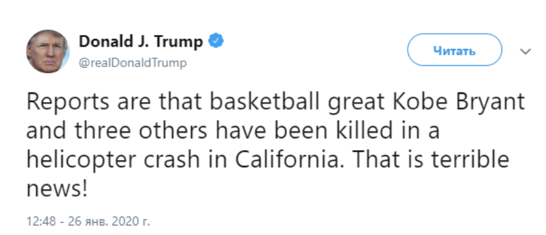 Мелания и я посылаем наши самые теплые соболезнования Ванессе (жена Коби Брайанта - Ред.) и замечательной семье Брайанта. Да пребудет с вами Бог!", - написал Трамп в своем Twitter.