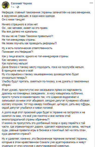 "Нефедов, главный таможенник Украины запечатлён на секс-вечеринке, в окружении девушек, в садо-мазо одежде. Он с ними танцует. Ничего страшного в этом нет. Он , как человек, имеет на это право. Мы все далеко не идеальны.