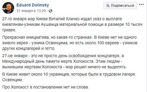 "27-е января - это не просто день освобождения концлагеря, а Международный день памяти жертв Холокоста. Этим людям - выжившим жертвам Холокоста - мэр решил ничего не выделять. В Киеве живет около 10 украинцев, которые были в трудовом лагере Освенцим. Про Холокост в постановлении нет ни слова" - написал Долинский.