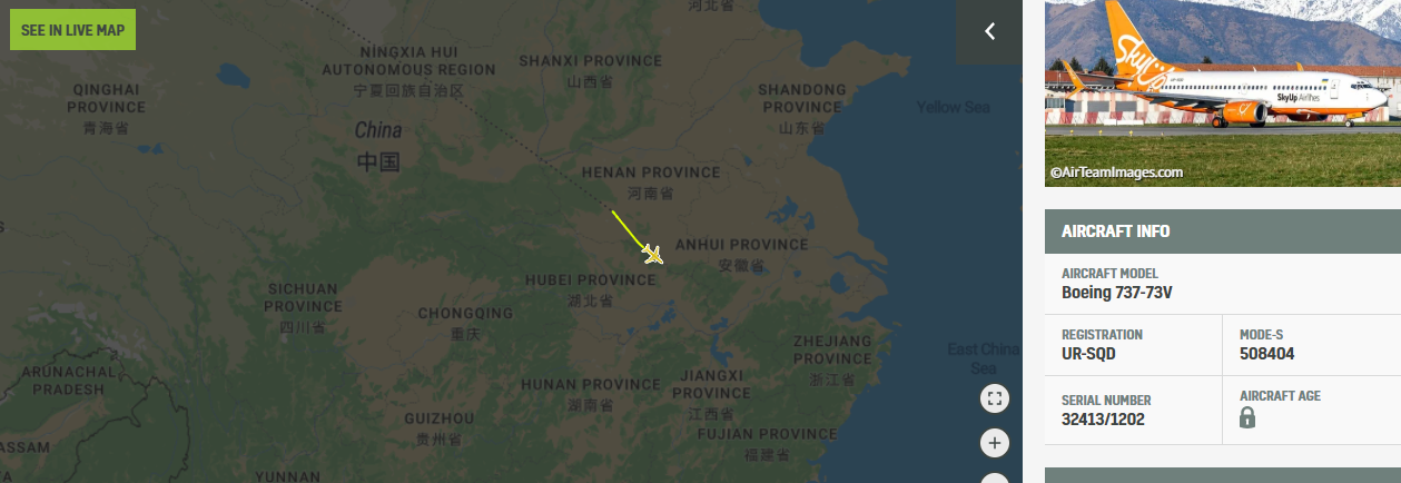 15:00 Самолет уже возле провинции Хубэй, столицей которой является Ухань.