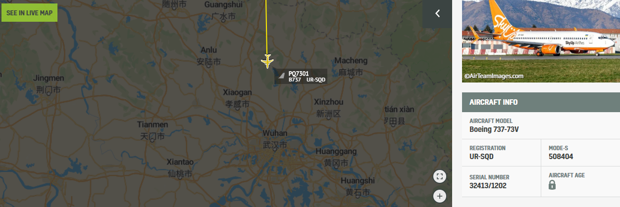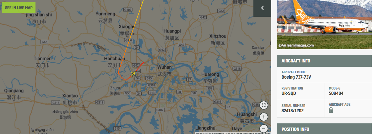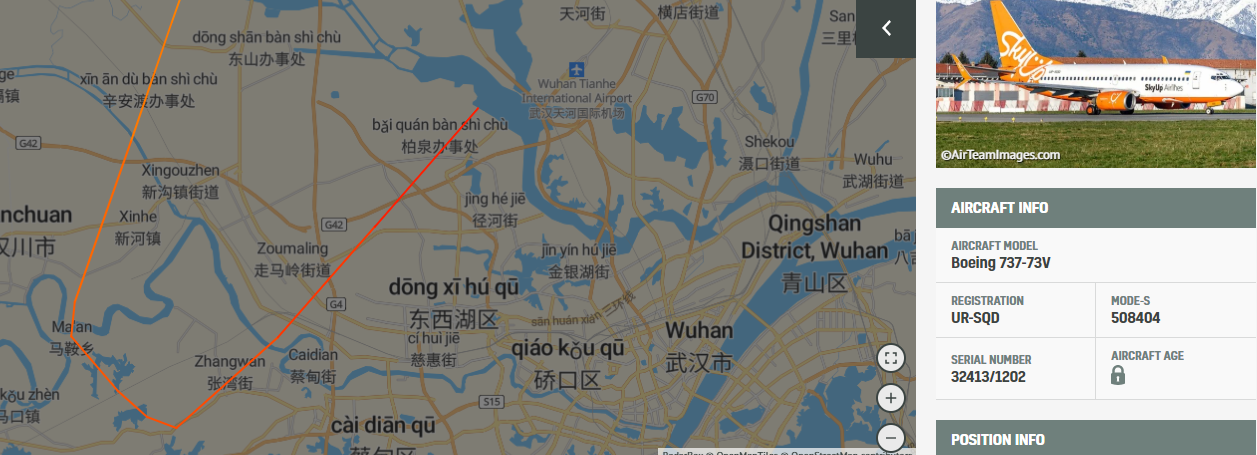 15:44 Судя по данным сервиса radarbox24.com, украинский самолет приземлился в аэропорту Уханя.