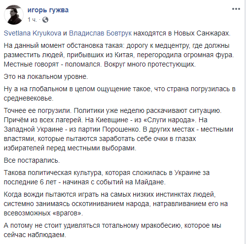 "Это на локальном уровне. Ну а на глобальном в целом ощущение такое, что страна погрузилась в средневековье. Точнее ее погрузили. Политики уже неделю раскачивают ситуацию. Причем из всех лагерей. На Киевщине - из "Слуги народа". На Западной Украине - из партии Порошенко. В других местах - местными властями, которые пытаются заработать себе очки в глазах избирателей перед местными выборами. Все постарались.