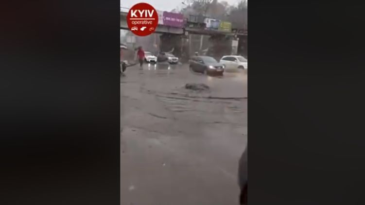 Так, из-за сильного дождя со снегом возле станции метро "Сырец" утром образовался потоп. Очевидно, ливневки не справляются с нагрузкой. Вода скопилась и на проезжей части, пешеходы не могут перейти дорогу.