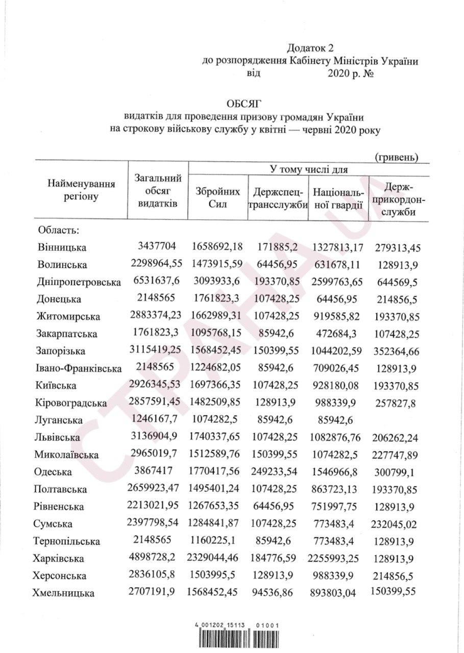 Общий объем государственных трат на весенний призыв-2020 оценивается в 70,730759 млн грн. Из них на ВСУ потратят 38,67417 млн грн, на Госспецтрансслужбу - 3,007991 млн грн, на Нацгвардию - 23,462329 млн грн, на Госпогранслужбу - 5,586269 млн грн.