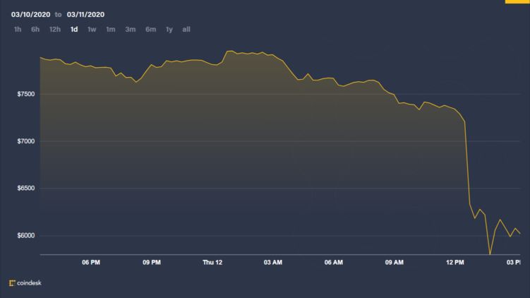 Курс биткоина резко обвалился до почти 6000 долларов из-за коронавируса и неопределенности на нефтяном рынке.