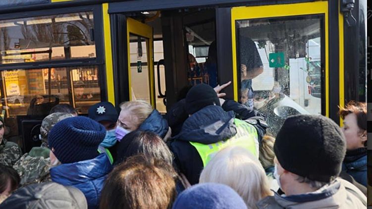 Сегодня, 19 марта, возле метро "Черниговская" люди штурмуют автобусы и перекрывают дороги в связи с карантинными мерами в городе.